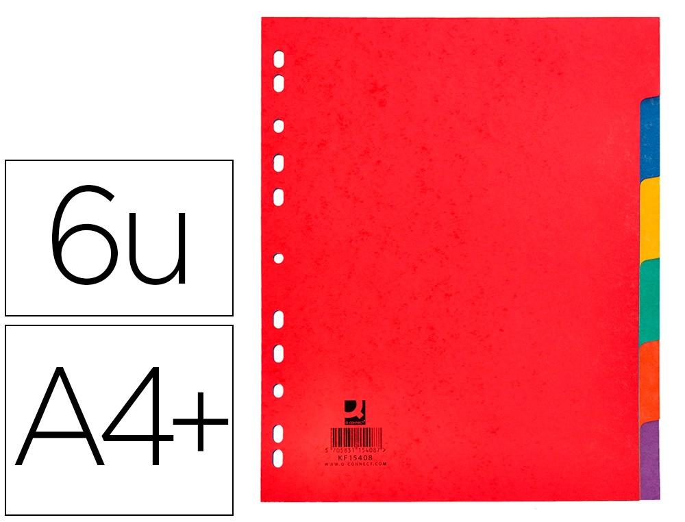 Jeu d’intercalaires fabriqués en carte lustrée 0,3 mm de couleur de 225 g/m². Disposition en échelle pour faciliter la consultation et l’identification des documents. Perforation permettant d’archiver dans un classeur ou autre dossier avec anneaux. Coloris opaques. Produit certifié PEFC. Référence: KF15408.